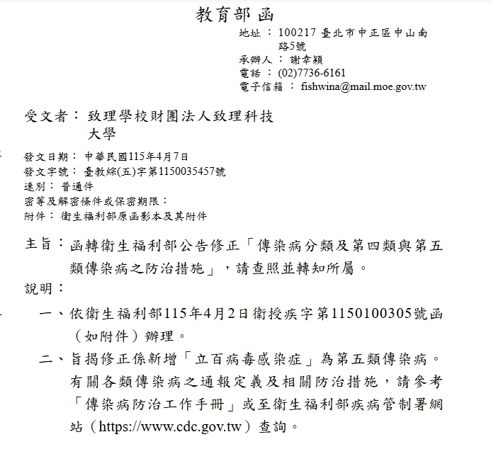 教育部函轉衛生福利部公告「立百病毒感染症」為第五類傳染病