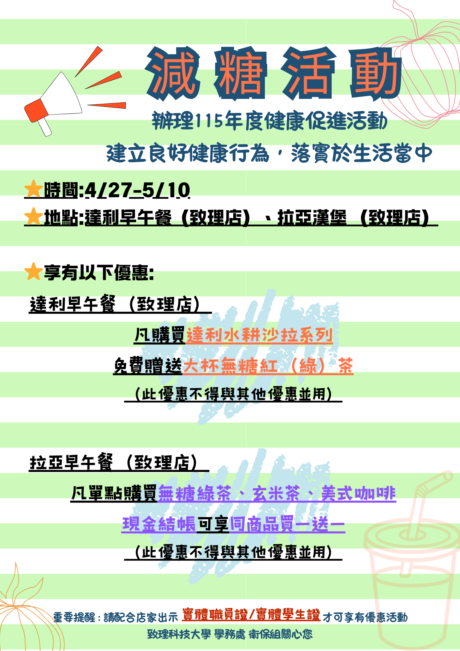 【衛生保健組】辦理115年度健康促進活動,⭐「4月27日(星期一)~5月10日(星期日)至「達利早午餐(致理店)」、「拉亞漢堡 (致理店)」 享有無糖優惠活動